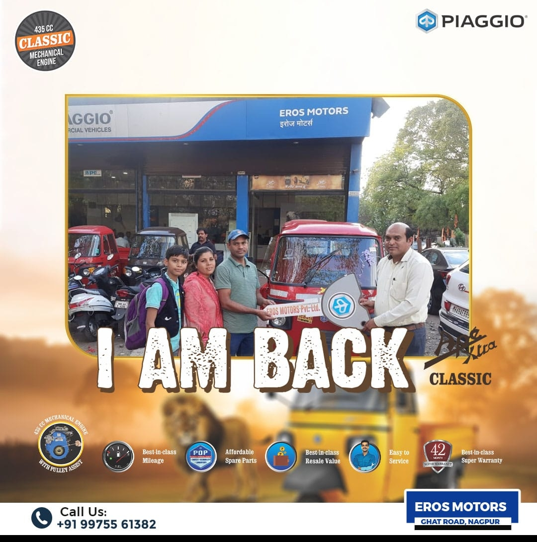 3 Wheeler showroom Nagpur delivery at our Eros Motors Pvt Ltd authorised dealer of Piaggio Vehicle Pvt Ltd. Contact - 9371444026.