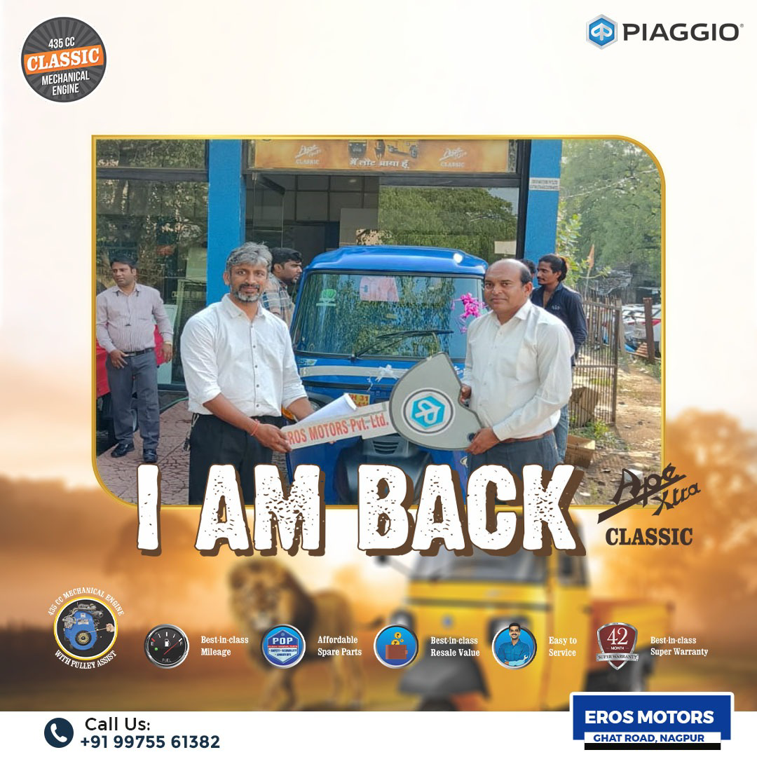 There wheeler Ape showroom at our Eros Motors Pvt Ltd authorised dealer of Piaggio Vehicle Pvt Ltd. Add - Cotton market Sq. to Mokshadham road, Near Hyundai Dealership Ghat Road, Nagpur- 440018. Contact no - 9371444026